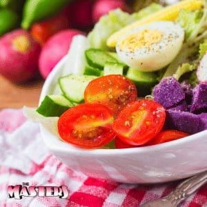 With romaines, cucumbers, tomatoes, onions, cheddar cheese, ham, turkey, eggs, bacon, and croutons.