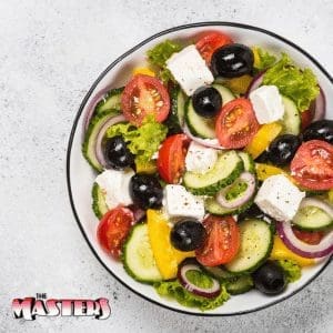 With romaines, cucumbers, tomatoes, onions, banana peppers, peppers, feta, and croutons.